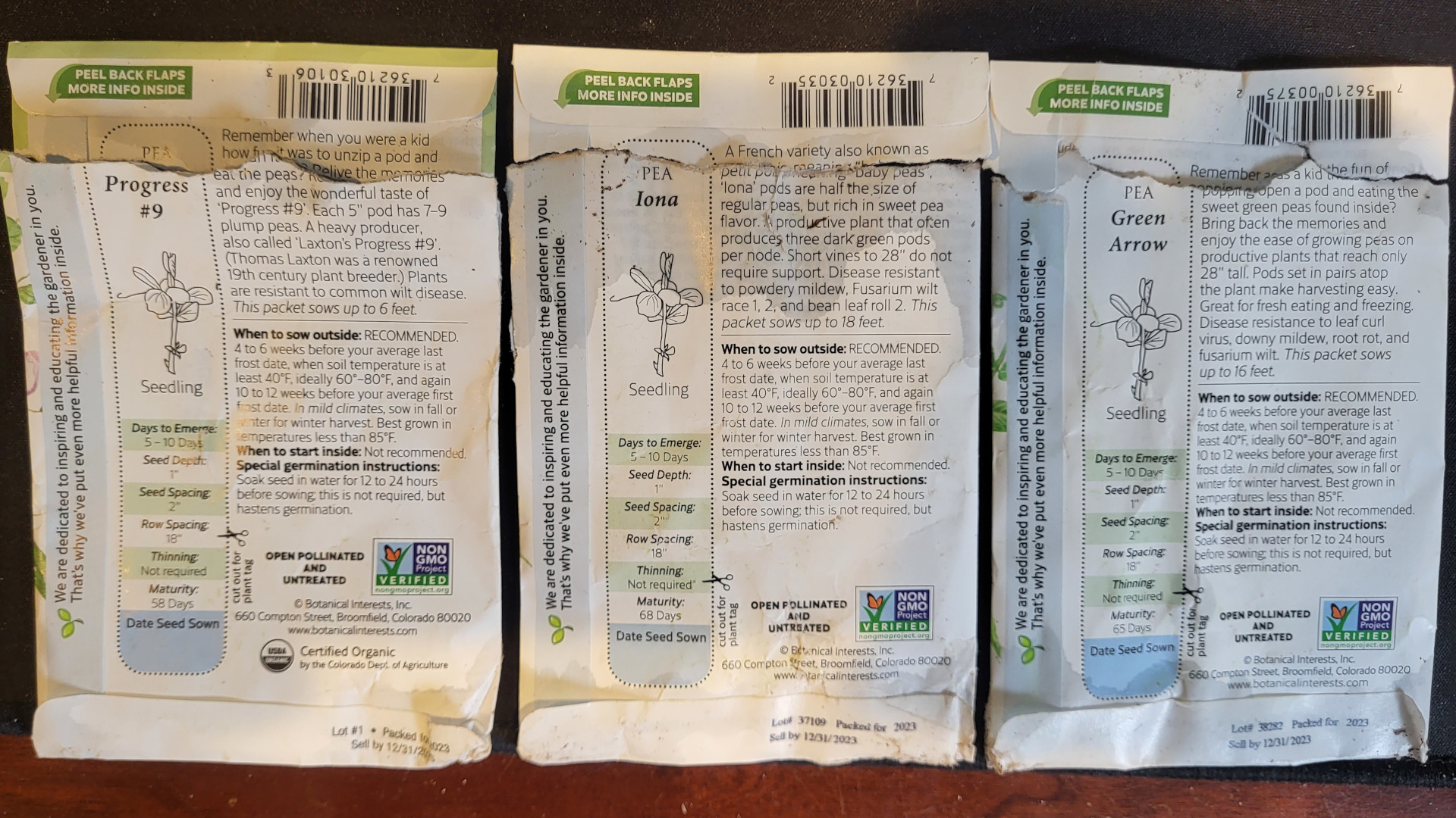 Today I planted three varieties of peas near each fence post along the “new garden fence”, and somewhat randomly in the main garden. I used a digging bar to create a small hole and added several seeds from each of the three seed bags to each hole. The digging bar was necessary to puncture the landscape fabric. We get a lot of what some people refer to as “chokeweed”, but what I believe is a variety of morning glory. I don’t mind this “weed”, but it does tend to outcompete other plants. I’m planting the peas as part of an overall campaign to grow some climbing plants along a new garden fence. Later, I’ll also add in some other climbing plants (that will be started indoors first, soon). Hopefully this will create a larger variety of climbing plants to compete with the morning glory (and I plan to plant some other varieties of morning glory as well).