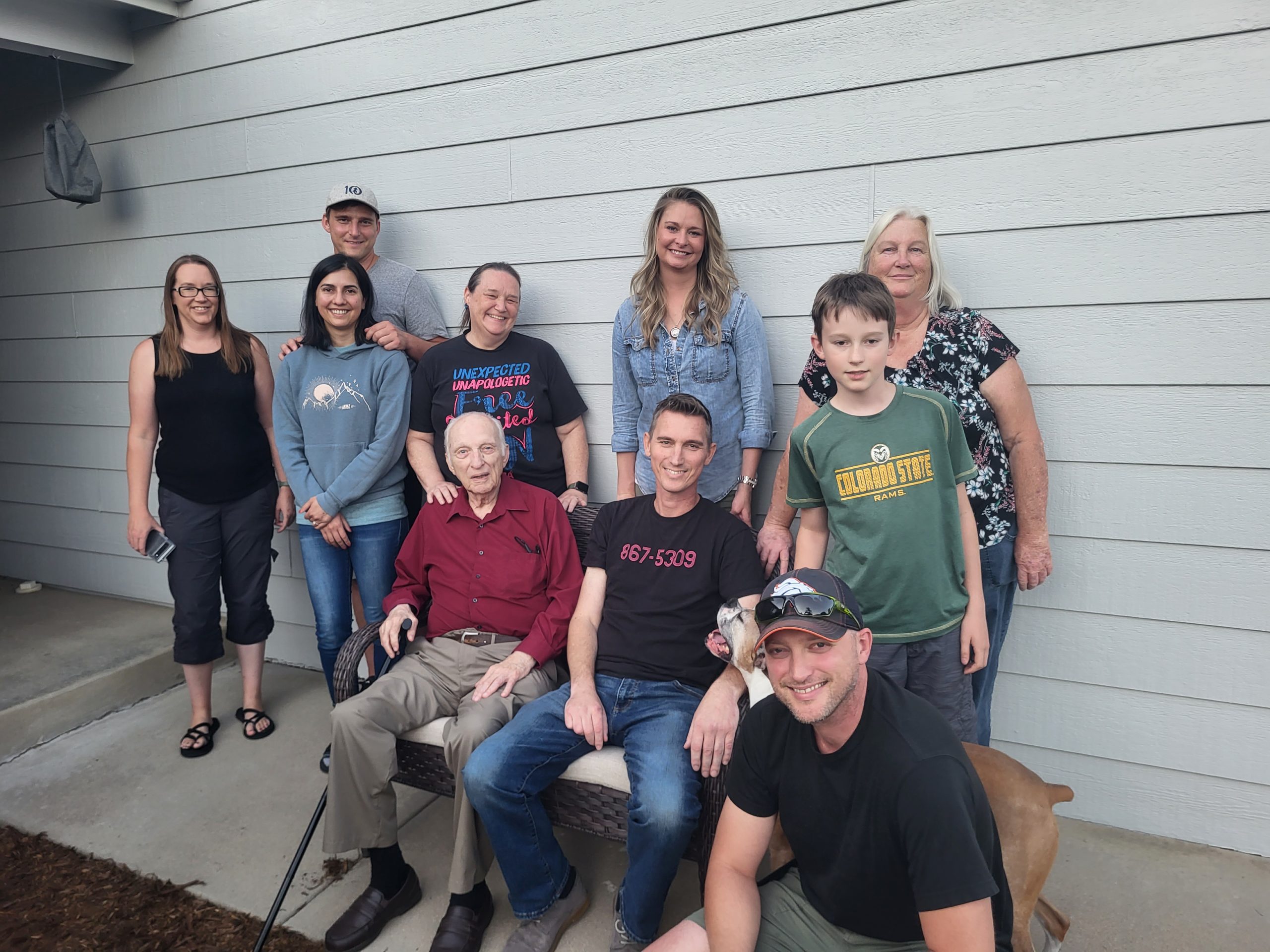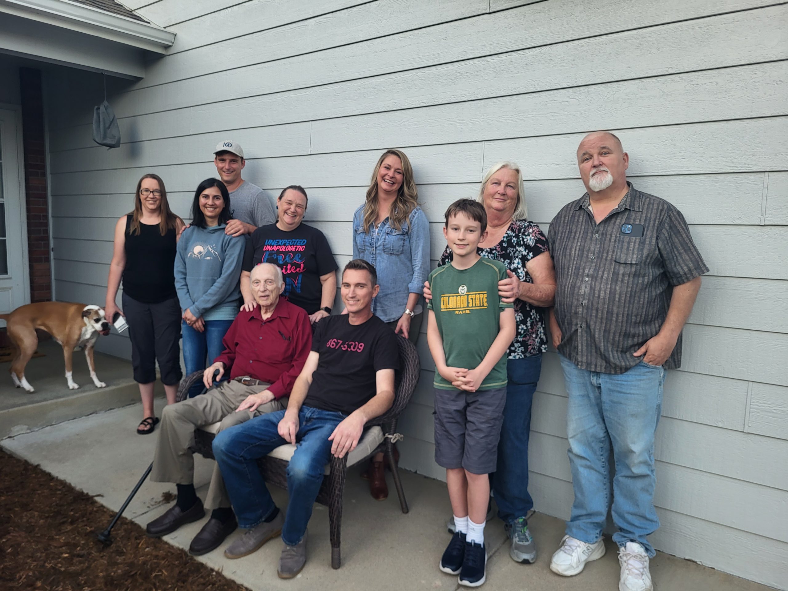 In September 2022, my uncle Mark, aunt Joy, and grandfather Lee (who we can Grandad) visited Colorado. We were over at my mom’s (Lori’s) house, and my mom wanted to get a group photo. We didn’t have a tripod, just phone cameras, so we were not able to get everyone in the photo at once. Mark and I were the ones taking pictures so we were never in the same picture. We used a post to try to get all the photos at the same angle. Here’s Mark setting up (and wondering why I’m taking this pic):