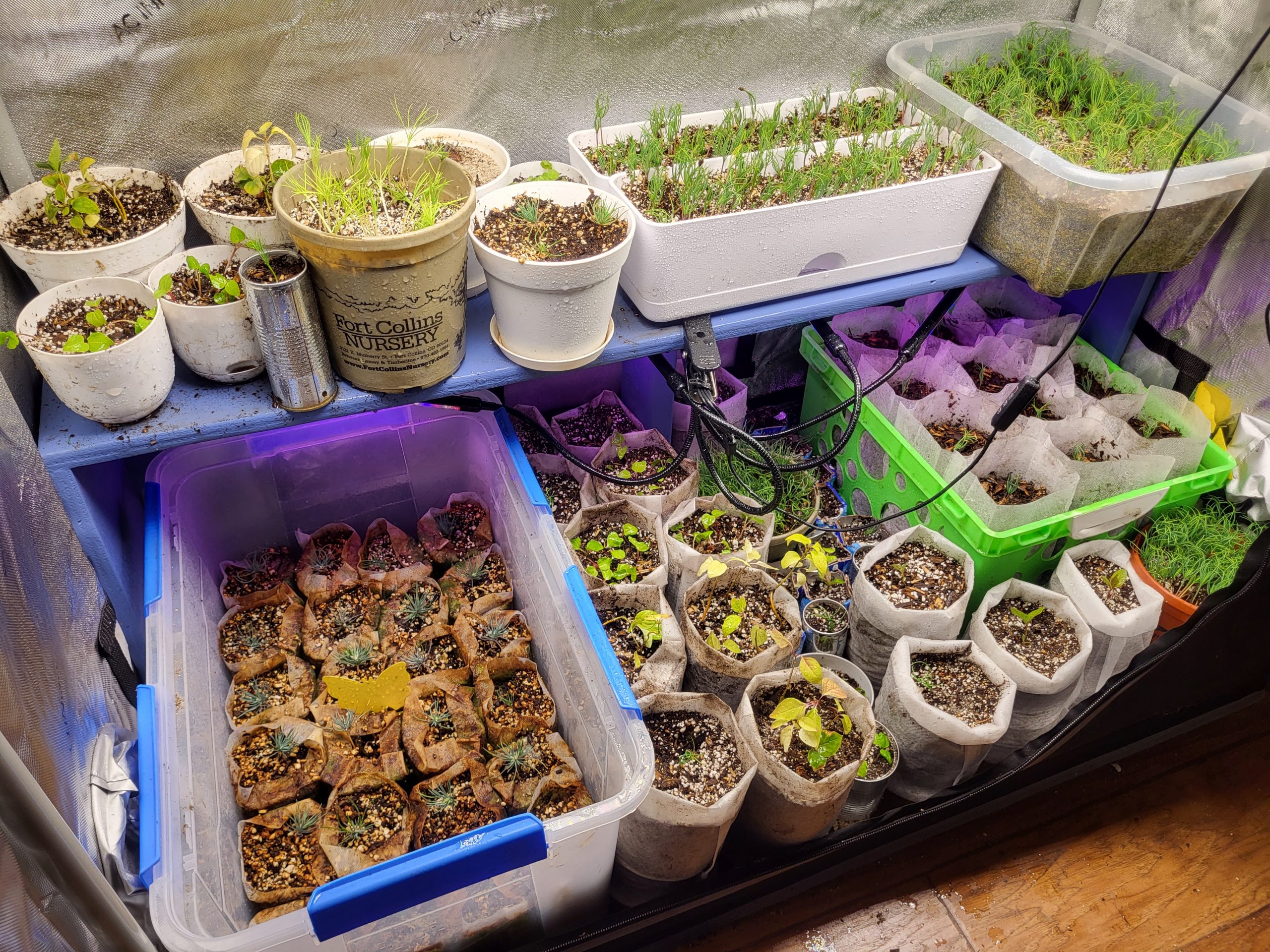 Just a quick update on the grow tent. I had a small pot with Virginia Creeper grown from seeds collected in the area. The seedlings were doing really well and I needed to separate them. I had a similar situation with a pot of Lilacs (I think the seeds for these came from the lilacs at my mom’s house). And, as you can see in the pic, I have a lot of Ponderosa pine seedlings that I need to figure out what to do with soon. I also had four Chokecherries popping up. So I started separating the various species into more grow bags. I’m just putting one pine and one Chokecherry in each grow bag. I’m putting multiple lilacs and Virginia creeper in each grow bag (not mixing species). For the seedling pots without any germination activity yet (e.g. Rocky Mountain Maple), I’m keeping these somewhere else. The only advantage to the tent is the warmth, but I’m looking into ways to keep the seedling pots the right temperature before germination. Right now, the plan is to spend a little time each weekend separating seedlings into grow bags. When the weather gets warmer, I’ll start moving grow bags outside with the healthiest plants. I’ll plant some plants in the ground at my house property in Fort Collins, but most of these are destined for my cabin property in Red Feather Lakes.